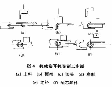 汽車板簧生產(chǎn)工藝中,卷耳和包耳工序是關(guān)鍵。但由于各個汽車板簧生產(chǎn)廠家的設(shè)備不同,則卷耳與包耳的成形方法各異。一般講有用機(jī)械傳動的、機(jī)械液壓雙重傳動的和全液壓傳動的卷耳機(jī)進(jìn)行卷耳、包耳工序。 用機(jī)械傳動卷耳機(jī)進(jìn)行卷耳的工序如下圖4所示。
