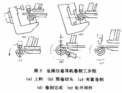 此種方法是靠模板的推移和工件沿模型強(qiáng)制卷曲成形,故稱之為推卷法。此法生產(chǎn)的卷耳、內(nèi)孔需整形,以確保精度。 用全液壓卷耳機(jī)進(jìn)行卷耳的工序如下圖5所示。